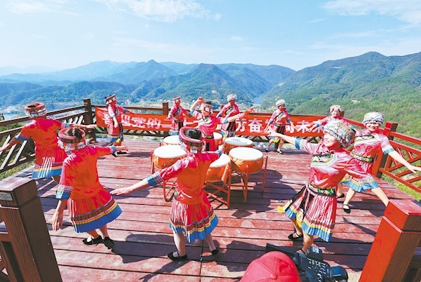 10月16日,松滋市卸甲坪土家族乡群众载歌载舞喜庆党的二十大胜利召开。    (视界网 杨松刚 摄)